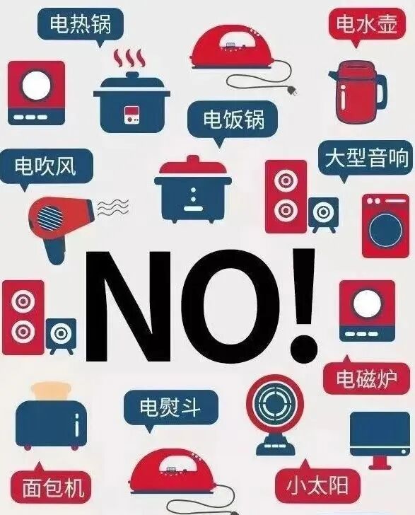 高功率电器是学生寝室火灾的首要隐患,宿舍内禁止使用热得快、电炉、电水壶等高功率或易燃设备。尤其是冬季降温时期,公寓宿舍也禁止使用小太阳烤火器、电热毯、暖风机等大功率取暖设备。